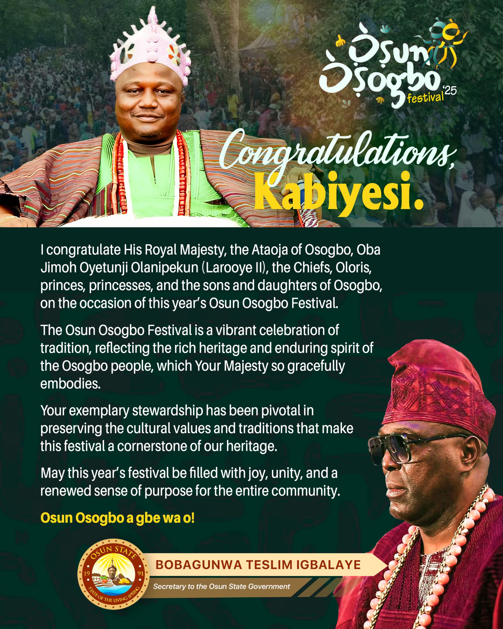 The Secretary to the Osun State Government (SSG), Bobagunwa Teslim Igbalaye, has felicitated the Ataoja of Osogbo, His Royal Majesty Oba Jimoh Oyetunji Olanipekun (Larooye II), his Chiefs, Oloris, princes, princesses, and all indigenes of Osogbo on the celebration of the 2025 Osun Osogbo Festival.