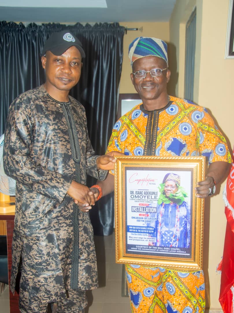 The NUJ team, which included Deputy Chairman Comrade Olawumi Olaniyi, General Secretary Comrade Kamil Raheem, and Treasurer Comrade Bukola Osunwo, also presented a framed portrait to Dr. Omoyele in recognition of his new traditional title.