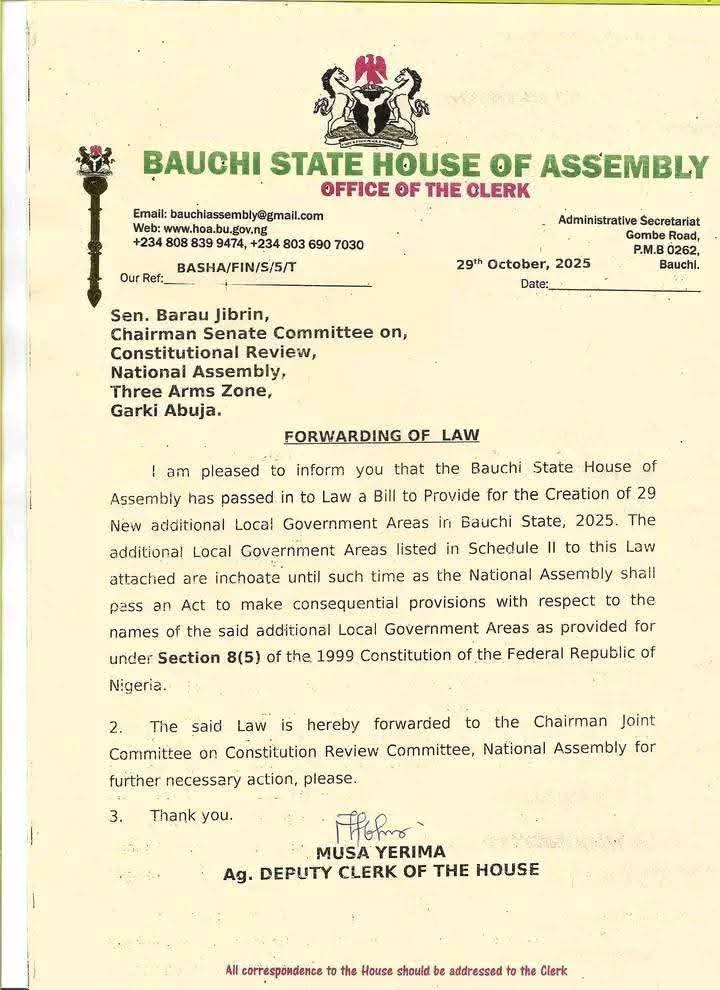 The Bauchi State House of Assembly has approved a bill establishing 29 additional Local Government Areas (LGAs) across the state.