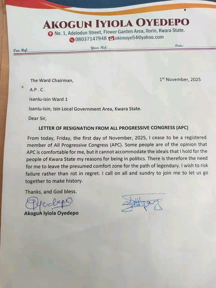 In a resignation letter dated Saturday, November 1, 2025, and addressed to the Ward Chairman of the party in Isanlu-Isin Ward 1, Isin Local Government Area, Oyedepo stated that his decision was born out of conviction and the desire to pursue a higher political purpose beyond personal comfort.